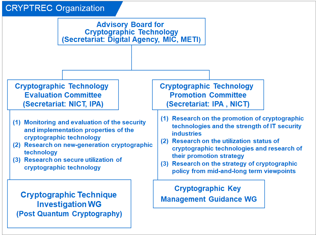 The Advisory Board for Cryptographic Technology includes the Cabinet Secretariat, the Digital Agency, the National Police Agency, the Ministry of Internal Affairs and Communications(MIC), the Ministry of Justice, the Foreign Ministry, the Ministry of Finance, the Ministry of Education, Culture, Sports, Science and Technology, the Ministry of Health, Labour and Welfare, the Ministry of Economy, Trade and Industry(METI) and the Ministry of Defense participate as the observers.